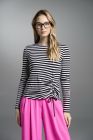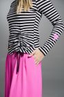 Брюки расширенного силуэта "палаццо", с центральной застёжкой на молнию и петлю-пуговицу.