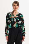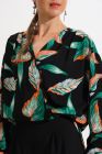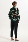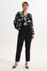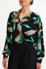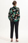 Брюки выполнены из однотона, блуза из ткани с принтом.