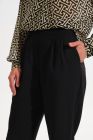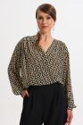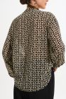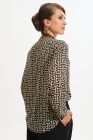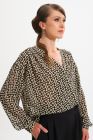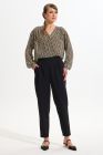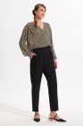 Брюки выполнены из однотона, блуза из ткани с принтом.