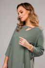 По переду горловина выполнена с вырезом "капля" и декоративной брошью.