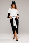 Нижняя часть платья выполнена с декоративными рельефами, разрезом и карманами.