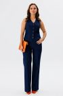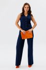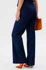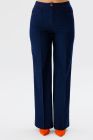 Брюки прямого силуэта с центральной застёжкой на молнию и петлю-пуговицу.