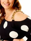 Горловина ассимертричная округлой формы с декоративной цепью на левом плече.
