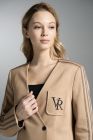 Жакет свободного покроя на подкладке контрастного цвета.