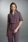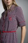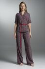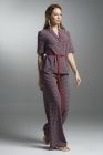В край борта, воротника, шов притачивания манжеты и боковой шов брюк и вставлен отделочный кант.
