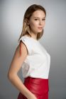 На правой стороне, в плечевом шве, сборка регулирующаяся декоративным шнуром с фиксатором.